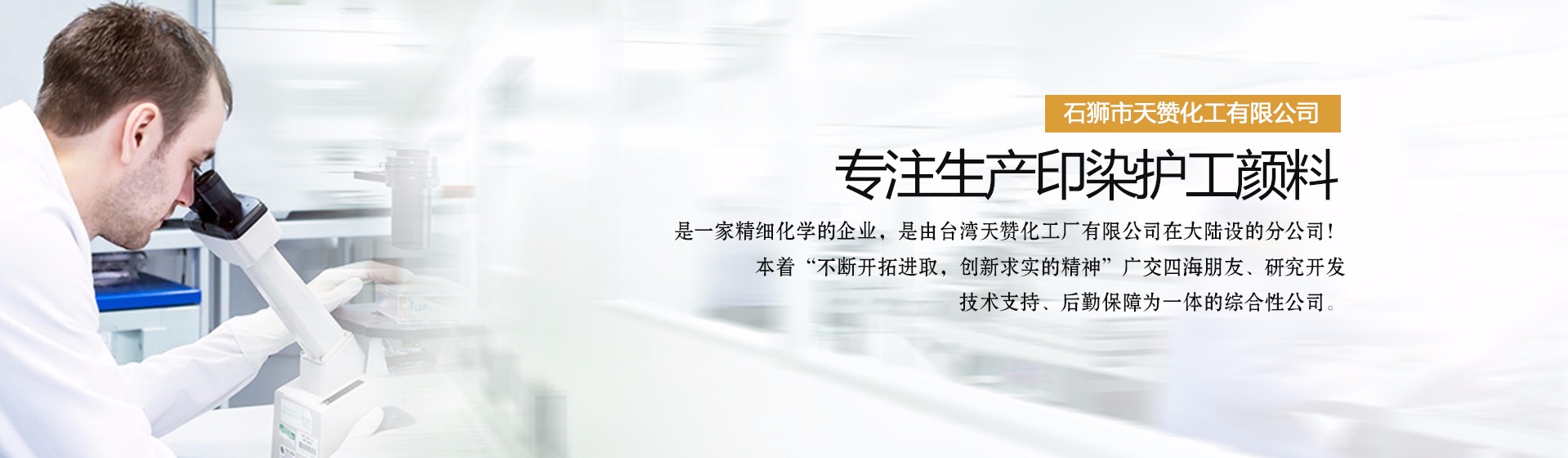 石獅市天贊化工有限公司是一家生產(chǎn)印染護(hù)工顏料的公司,是一家精細(xì)化學(xué)的企業(yè),是由臺灣天贊化工廠有限公司。在大陸設(shè)的分公司!本著“不斷開拓進(jìn)取,創(chuàng)新求實(shí)的精神”廣交四海朋友、研究開發(fā)、技術(shù)支持、后勤保障為一體的綜合性公司。二十年來,我們對紡織,前處理,后整理,技術(shù)的研究實(shí)踐中體會得經(jīng)驗(yàn)。